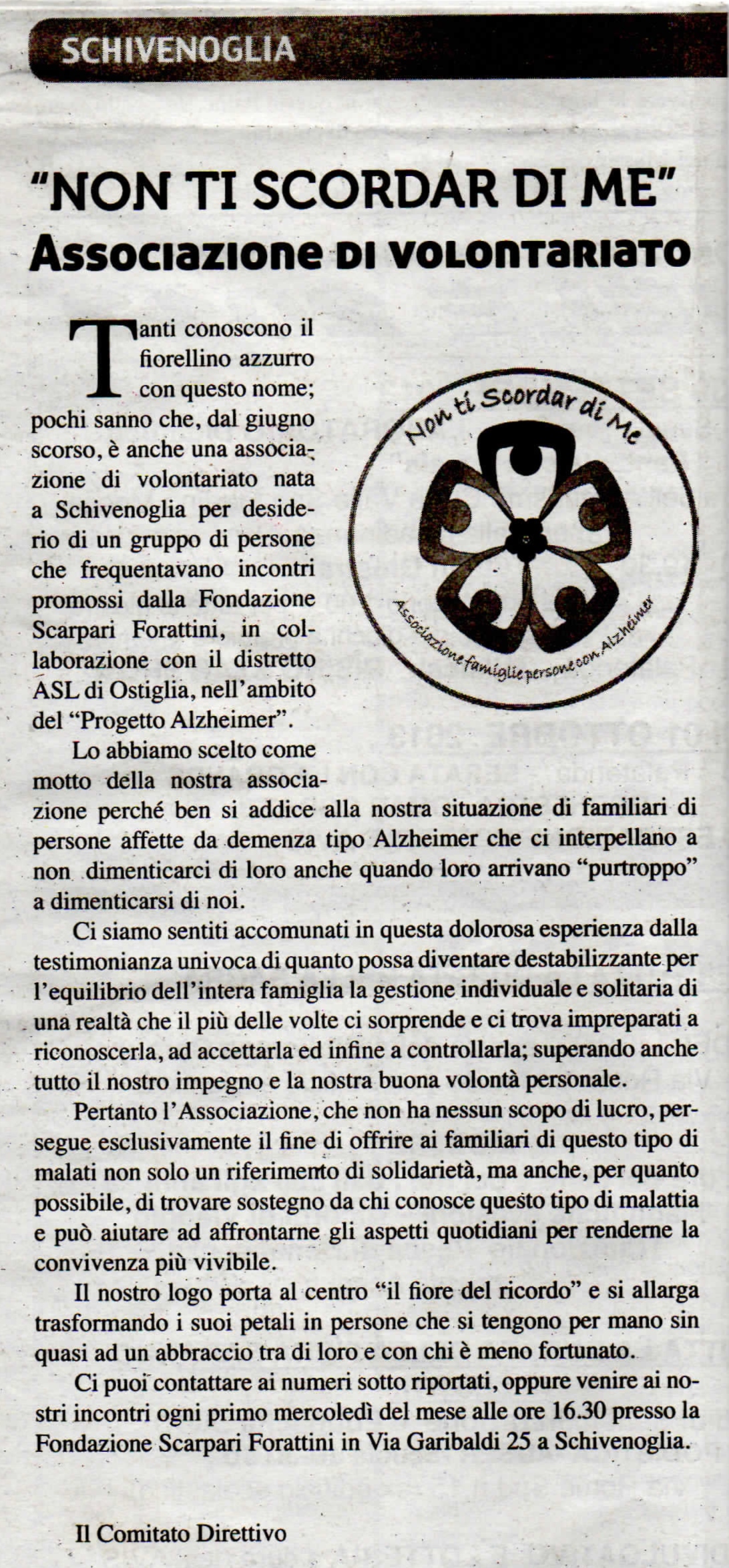 Tanti conoscono il fiorellino azzurro con questo nome; pochi sanno che, dal giugno scorso, è anche una associazione di volontariato nata a Schivenoglia per desiderio di un gruppo di persone che frequentavano incontri promossi dalla Fondazione Scarpari Forattini, in collaborazione con il distretto ASL di Ostiglia, nell’ambito del “Progetto Alzheimer”.