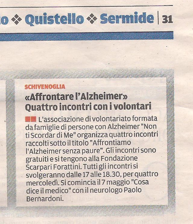 L’associazione di volontariato formata da famiglie di persone con Alzheimer ” Non Ti Scordar di Me” organizza quattro incontri raccolti sotto il titolo “Affrontiamo l’Alzheimer senza paura”. Gli incontri sono gratuiti e si tengono alla Fondazione Scarpari Forattini. Tutti gli incontri svolgeranno dalle 17 alle 18.30, per quattro mercoledì. Si comincia il 7 maggio ” Cosa dice il medico” con il neurologo Paolo Bernardoni.