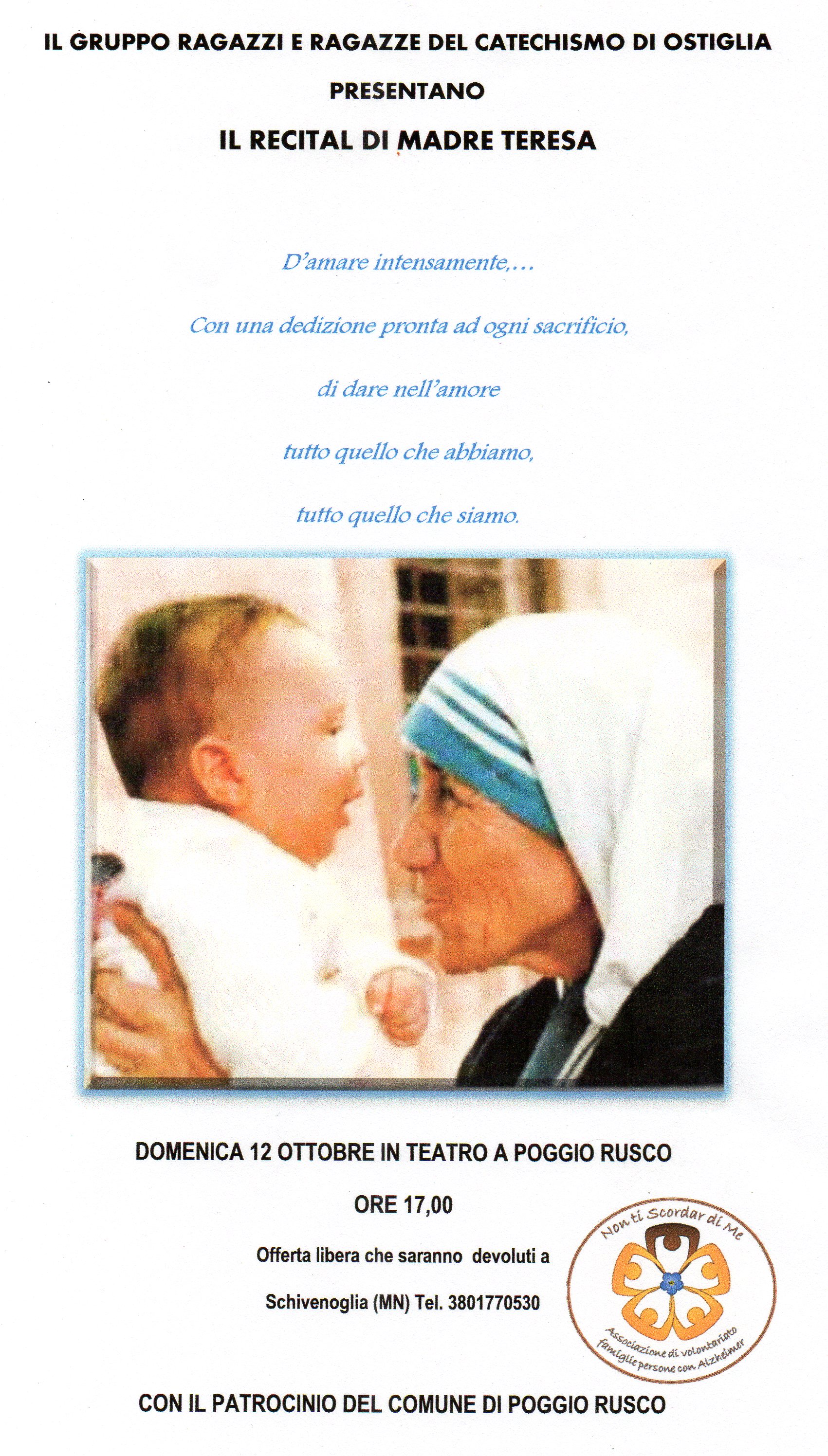 Il recital di Madre Teresa in teatro a Poggio Rusco viene presentato dal gruppo ragazzi e ragazze del catechismo di Ostiglia, domenica 12 ottobre in teatro a Poggio Rusco ore 17:00.