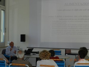 Ci si è pertanto soffermati sull’igiene personale, l’abbigliamento, l’alimentazione, l’idratazione, i rapporti personali, le attività fisiche e ricreative, la sicurezza; per arrivare a considerare il caso del malato che vive solo ed anche il rapporto con bambini e ragazzi che vivono a contatto di questa malattia in famiglia. Ancora una volta si è evidenziato il ruolo fondamentale dei familiari nel condurre l’assistenza e la cura del malato di Alzheimer. Costoro, seguendo criteri e modalità mirati sul come comportarsi adeguatamente, devono munirsi anche delle conoscenze specifiche di come affrontare le problematiche della gestione. Argomenti in parte già oggetto di precedenti incontri, ma che hanno ricevuto preziosi contributi di completezza ed arricchimento da parte del dr. Pedrazzoli tanto da suscitare numerose domande e indurre i presenti a portare le loro testimonianze dirette.